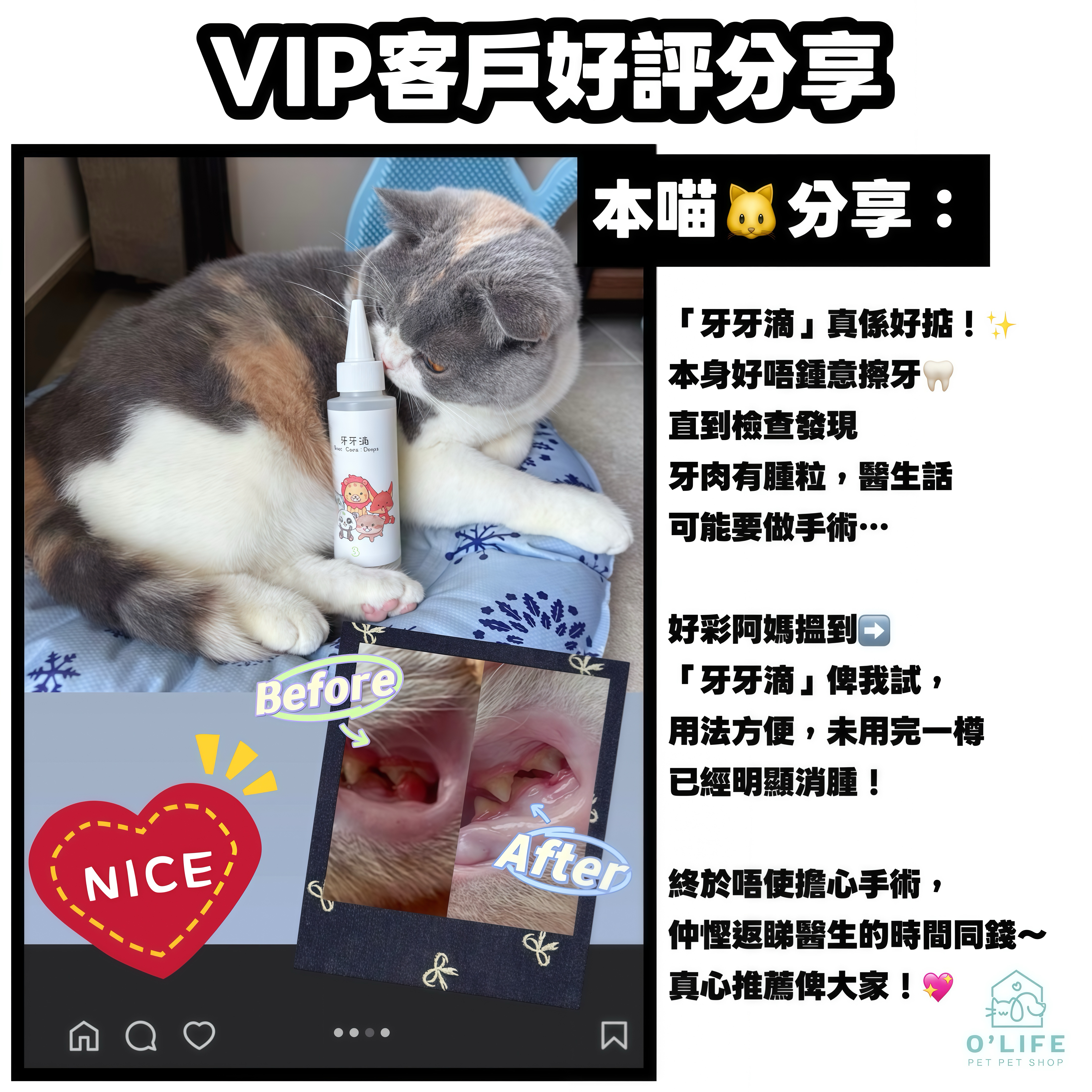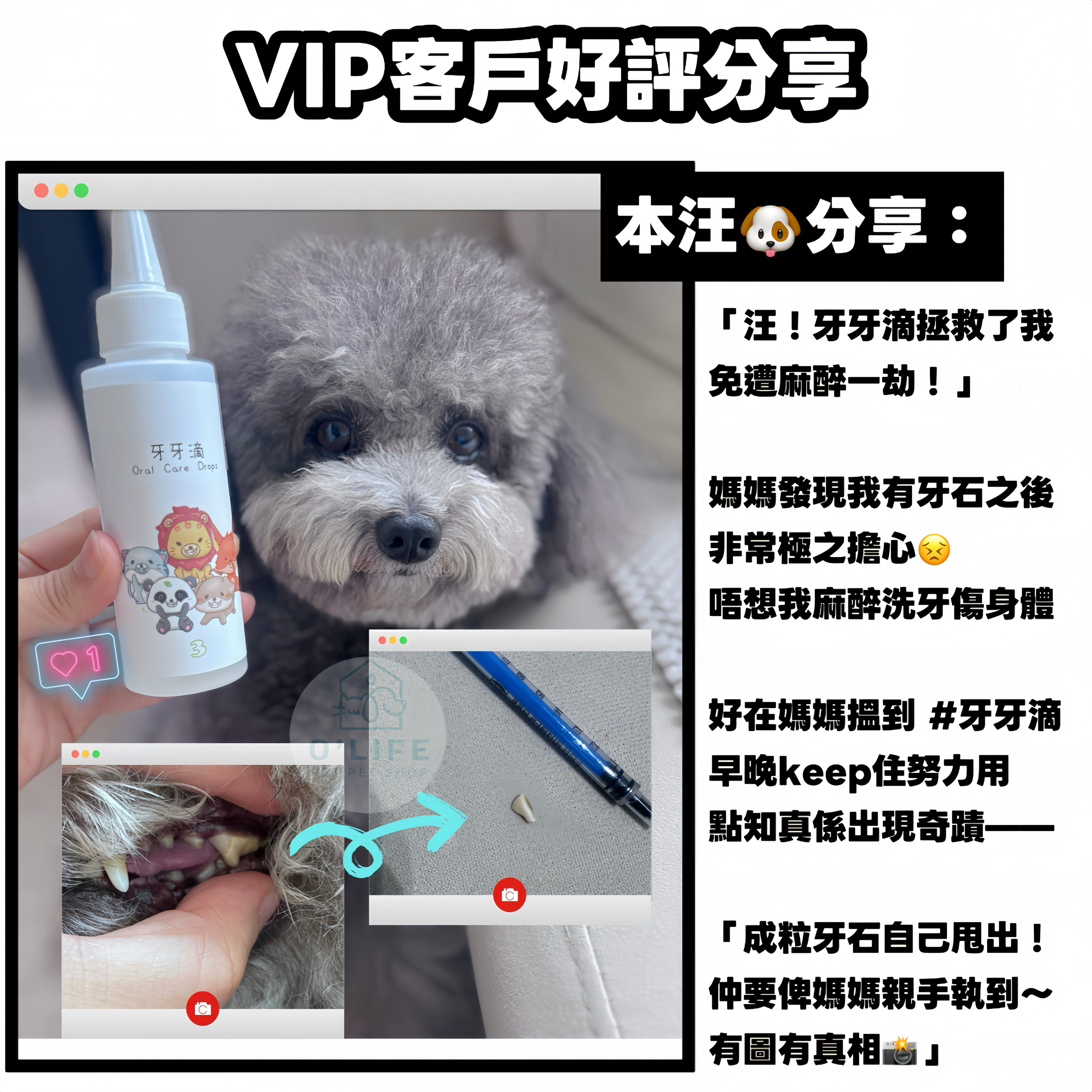 【牙牙滴 | 寵物全方位口腔護理解決方案】詳細介紹 由 台灣寵物中西醫院長合力研發 的「牙牙滴」,是一款革命性的漢本植萃口腔護理產品。我們以最溫和的天然成分,為毛孩打造最全面的潔牙方案,讓您輕鬆告別繁瑣的刷牙戰鬥! 🌿 全成分功效解析,給毛孩最細緻的守護: · 【天然潔齒 · 長效清新】 · 柿子萃取:富含單寧酸,從源頭分解牙垢與牙菌膜,幫助牙齒恢復自然潔白。 · 植物類黃酮:強大抗氧化,減少牙齦發炎與紅腫,強化口腔黏膜健康。 · 蛋白水解酶:溫和分解食物殘渣等蛋白質污垢,以「酵素潔牙」方式打破牙菌膜結構。 · 【舒緩修護 · 強健牙齦】 · 甘草根萃取 & 洋甘菊萃取:協同舒緩紅腫、敏感的牙肉,溫和鎮靜消炎,緩解不適感。 · 薏仁 & 枸杞:清熱利濕,改善上火問題;同時提供氨基酸與多醣體營養,維持牙齦組織健康與活力。 · 【長效防護 · 口氣清新】 · 食品級抗菌劑 & 聚甘油-4癸酸酯:雙重溫和抗菌機制,有效抑制口腔壞菌滋生,提供長效防護,預防問題復發。 · 【適口性佳 · 愛不抗拒】 · 赤藻醣醇 & 山梨糖醇:天然安全甜味劑,大幅提升適口性。 · 食品級甘油:使口感更順滑,確保產品穩定,讓毛孩不抗拒。 ✨ 產品核心優勢: 1. 溫和有效:中西醫結合理念,全成分溫和安心,效果顯著。 2. 簡單方便:無需刷牙,每日滴入口中,護理變簡單。 3. 全面護理:一次性針對牙菌膜、口氣、牙齦健康及牙石問題。 📋 使用方法與效果實證: • 最佳用法:直接滴於下顎兩邊牙骹位置,讓液體直接滲透於後牙區域,清潔效果更顯著。 • 正確用量 (每次每邊): 🐱 小型犬和貓咪:0.5 mL 🐶 中型犬:0.75 mL 🐕 大型犬:1 mL • 使用頻率:建議每日早晚各使用一次,簡單方便。 · 效果承諾: · 立即:感受口氣明顯清新 · 1-2週:可見牙齦紅腫問題改善 · 持續使用四星期:有效分解牙菌膜及牙結石 💰 優惠價格資訊: · 單支原價:$398 · 持續護理優惠套裝(更划算): · $650 / 2支 (平均每支$325) · $900 / 3支 (平均每支$300) · ❤️ 全店購物滿 $600 即可享免運費優惠! 每支100ml,約可使用50天,是守護毛孩口腔健康的高性價比首選。 牙牙滴不僅是產品,更是我們與您之間,為毛孩健康共同努力的橋樑。立即體驗,一起為寶貝打造健康自信的笑容! 如有任何疑問,歡迎隨時與我們聯絡!